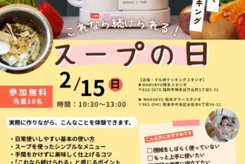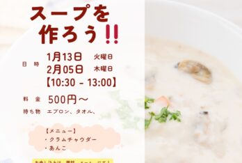 【スープの日】開催いたします!! [記事公開日]2026年01月22日 [最終更新日]2026年01月22日 Category - イベント情報 『これなら続けられる✨』 その理由を、実際に作って体感しませんか❓ 実は、 レシピを見るだけでは分からないことがあります。 ✔︎ どのくらい入れるの? ✔︎...続きを読む... 続きを読む 令和8年度 料理体験教室 担当:小澤 [記事公開日]2026年01月22日 [最終更新日]2026年01月22日 Category - クッキングスクール 🍲✨ マル球クッキング スクール✨🍲 今回のテーマは 「スープの力で、スープを作ろう!!」 寒い季節にぴったりの 心も体もほっとするスープ作り...続きを読む... 続きを読む